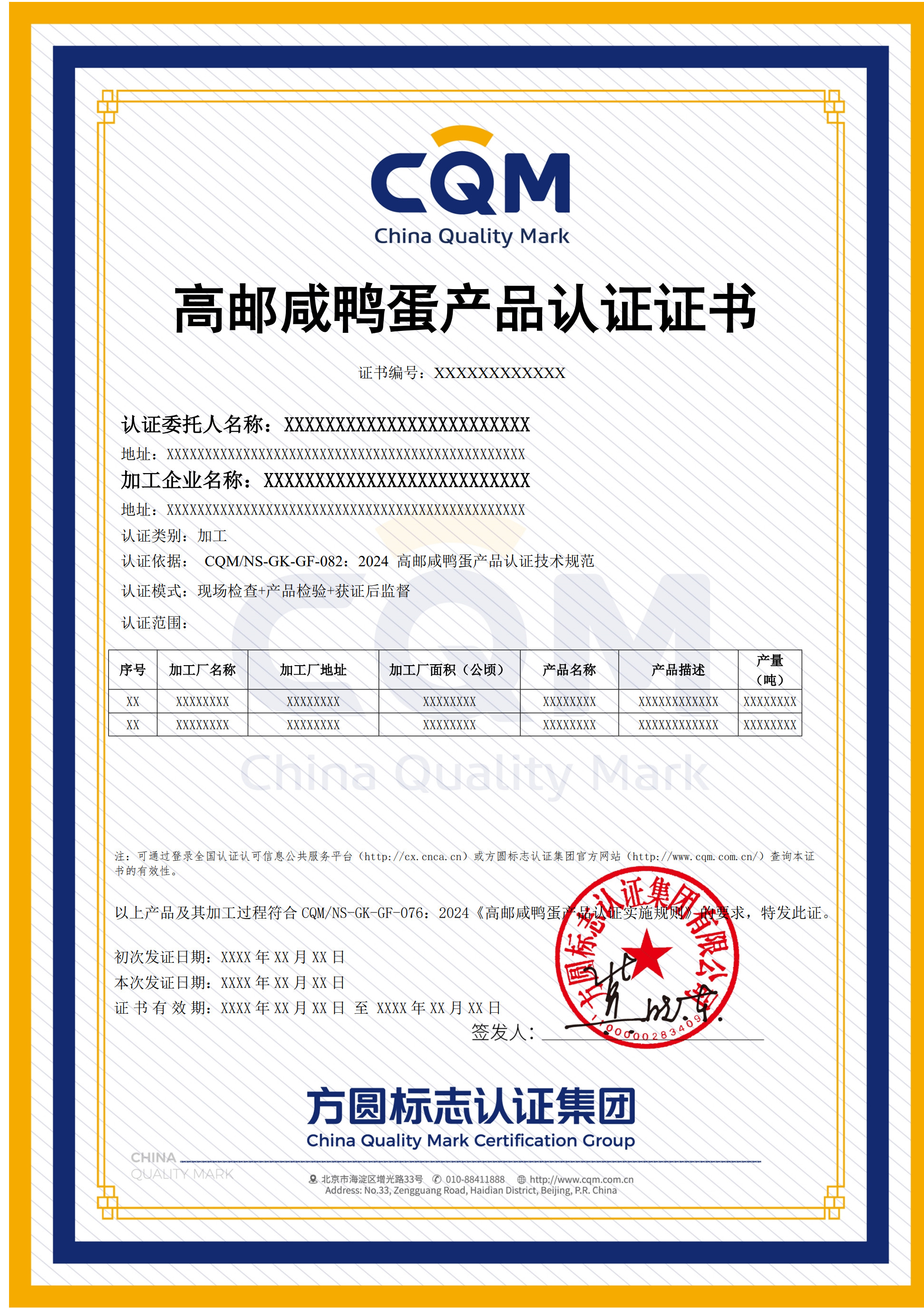 高邮咸鸭蛋是指在地理标志产品保护范围内,以高邮鸭特有的饲养方式饲养的高邮鸭所产的蛋经过挑选后为原料的蛋,经用盐水或含盐的黄粘土或草木灰腌制而成的再制蛋。具有鲜、细、红、油、嫩等特点。高邮咸鸭蛋产品认证是由CQM方圆第三方专业认证机构依照国家认证认可监督管理委员会认证管理要求,按照相应产品实施规则和技术规范的要求,对咸鸭蛋进行的合格评定活动。