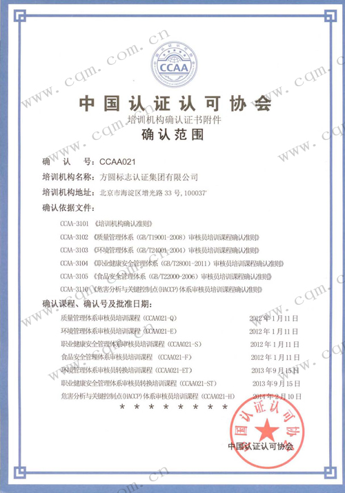 >中国认证认可协会确认证书