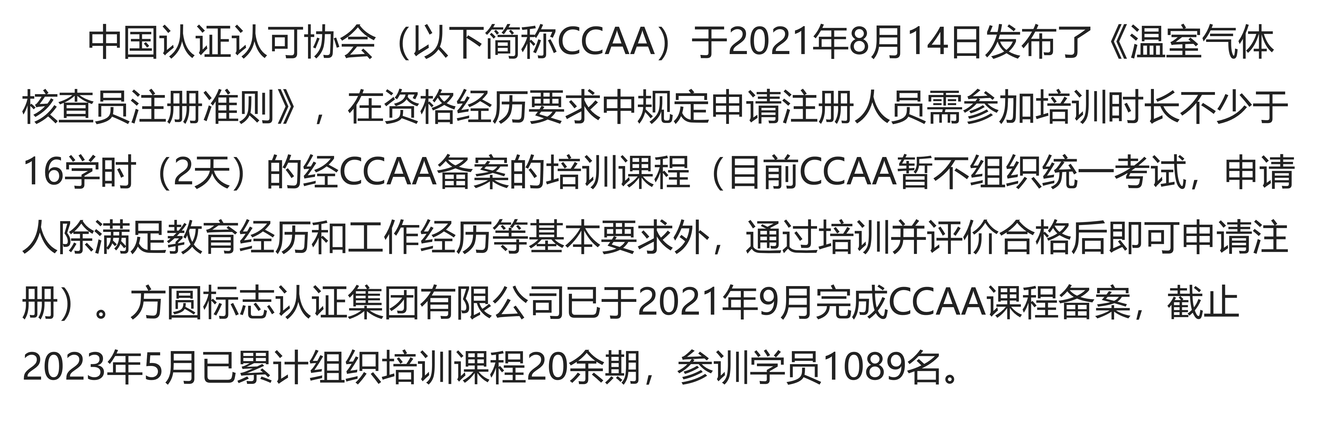 中国认证认可协会备案的《温室气体核查员基础课程培训合格证书》样本
