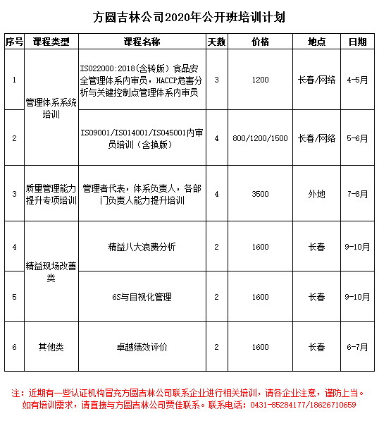 方圆吉林公司2020年公开班培训计划