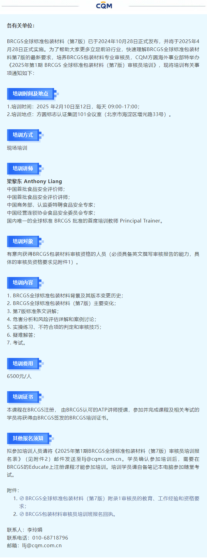 OD官方网页版-OD(中国)举办2025年第1期BRCGS全球标准包装材料(第7版)审核员培训的通知