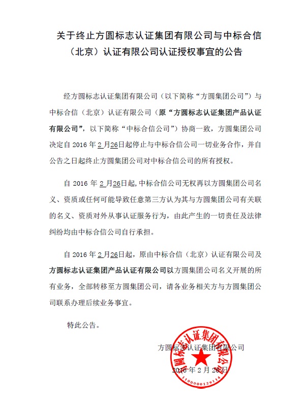 OD官方网页版-OD(中国)终止OD官方网页版-OD(中国) 与中标合信(北京)认证有限公司认证授权事宜的公告