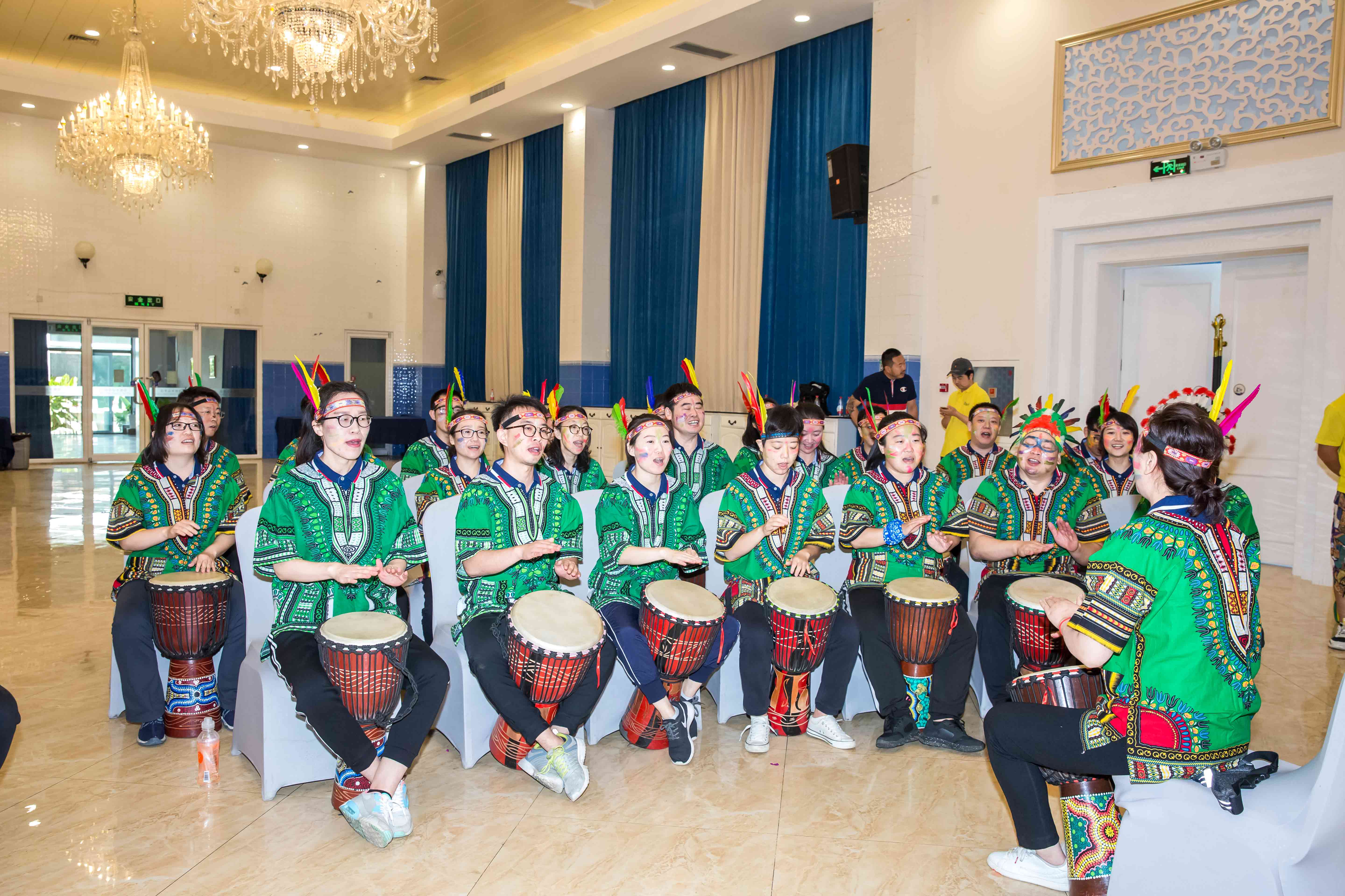 第二天在室内进行了经典拓展培训项目“非洲鼓”,全体员工分为四个部落,脸上化着原始的妆容,穿着美丽的部落服饰,从“咚嘟嘟”到“咚嘟嘟咚哒”,鼓点节奏学习的难度越来越高,但每个人散发的热情越来越高昂。最后,每个部落通过鼓乐师的指导下努力的学习和自身的创意为大家带来了精彩的“鼓舞表演”。