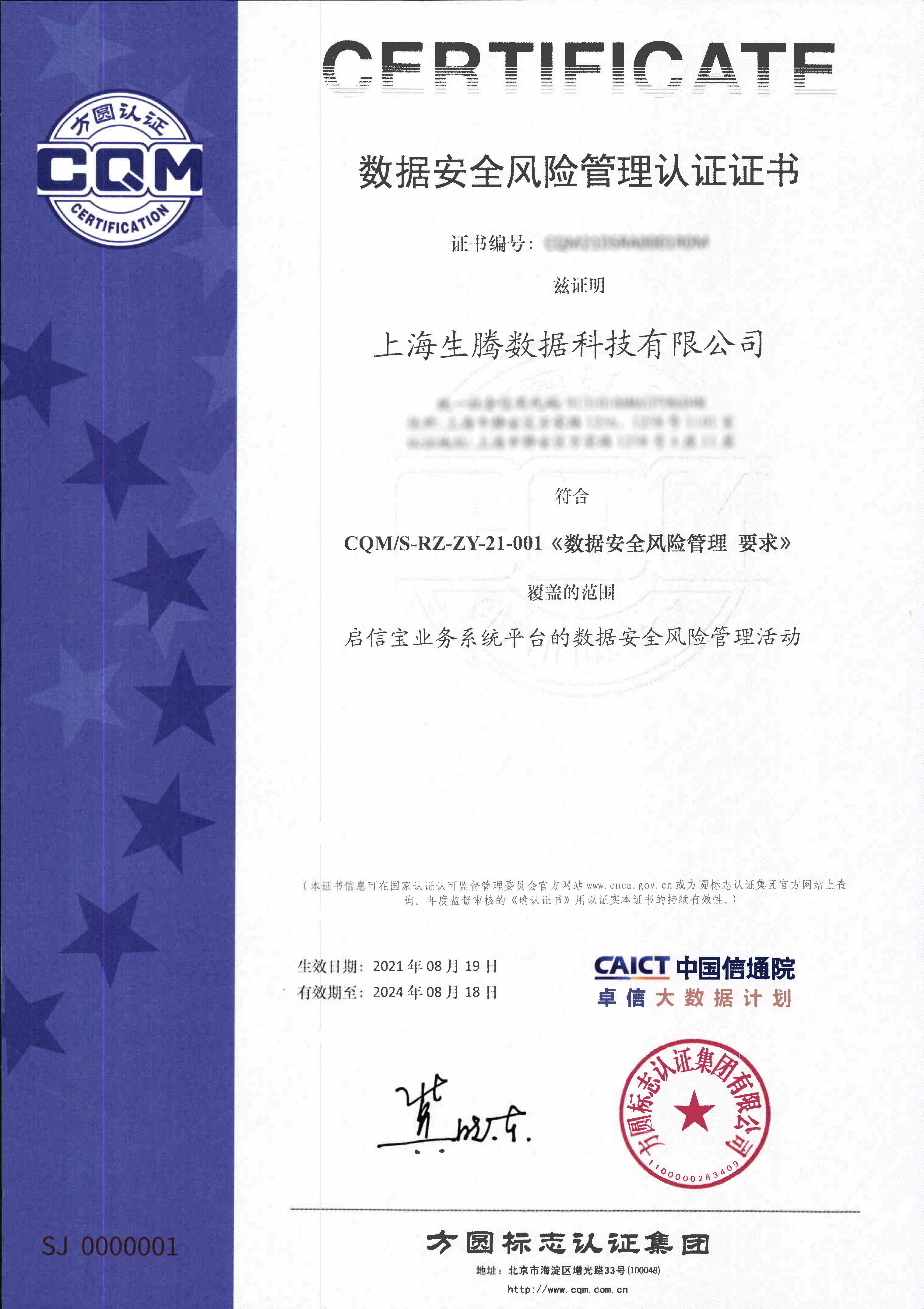 二、加强信息技术在安全检测和认证过程中的应用,消除交易各方对安全性的顾虑。例如:方圆标志认证集团主导开发的数据安全风险管理认证,通过检测平台系统及其数据的敏感接口、敏感数据、数据安全等因素,并对其数据生命周期(采集、传输、存储、使用、共享、销毁)风险管理的制度与实施进行评价,证实平台系统及其数据的安全性,及风险管理措施是否得当,是否满足相关要求。目前已经有新浪金融、桔子数字、上海生腾数据等科技公司通过了此项认证。