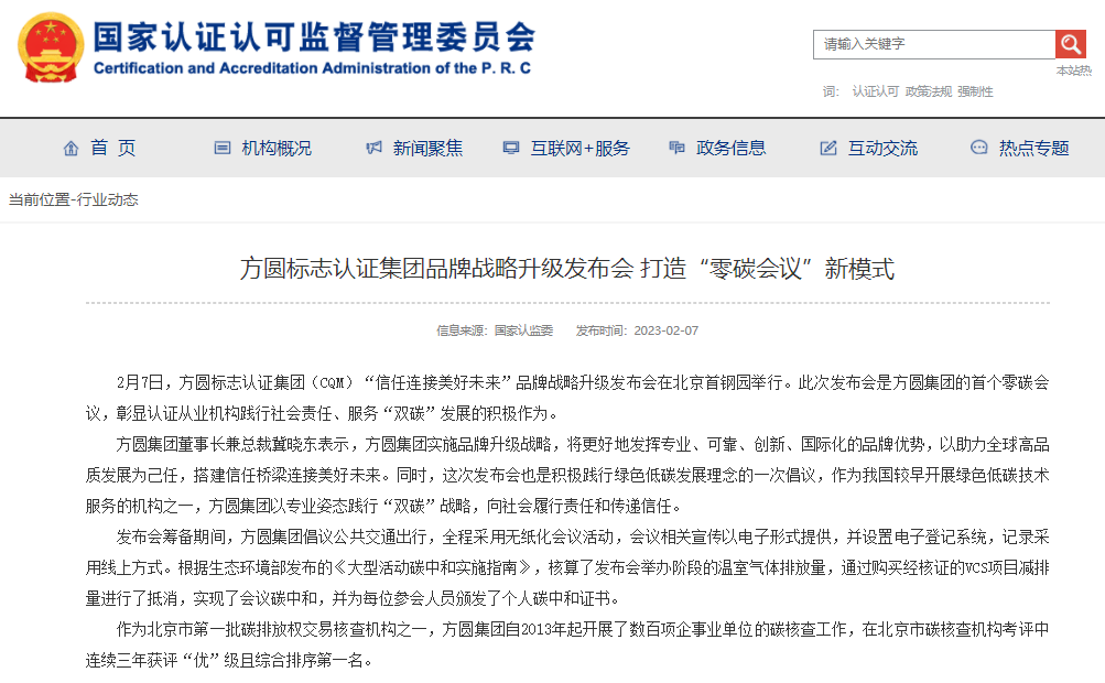 国家认监委官网刊发《方圆标志认证集团品牌战略升级发布会 打造“零碳会议”新模式》
