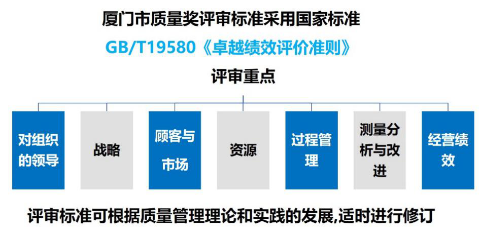 厦门市质量奖评审标准采用国家标准GB/T19580《卓越绩效评价准则》,着重对组织的领导、战略、顾客与市场、资源、过程管理、测量分析与改进、经营绩效等方面进行评审。评审标准可根据质量管理理论和实践的发展,适时进行修订。