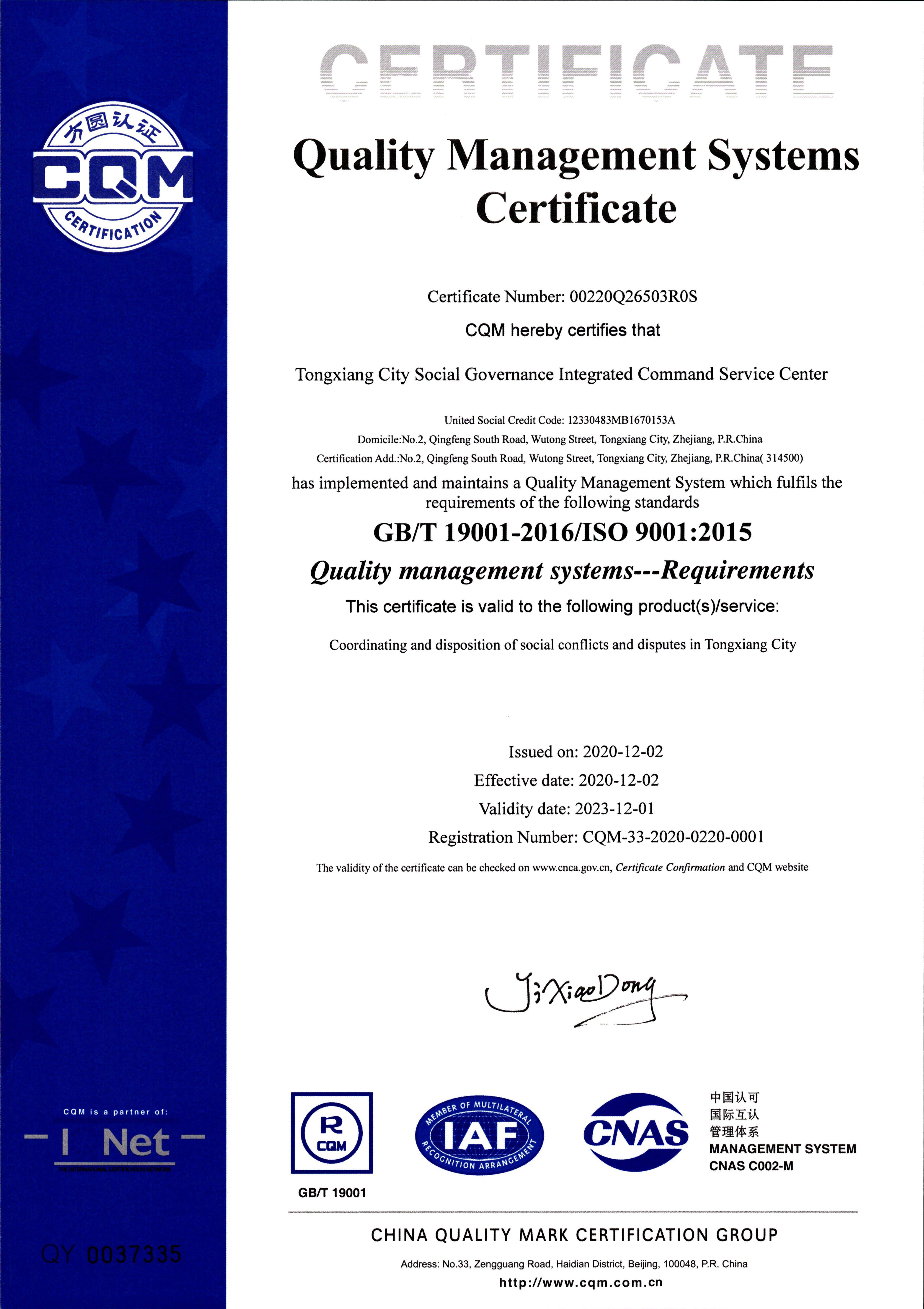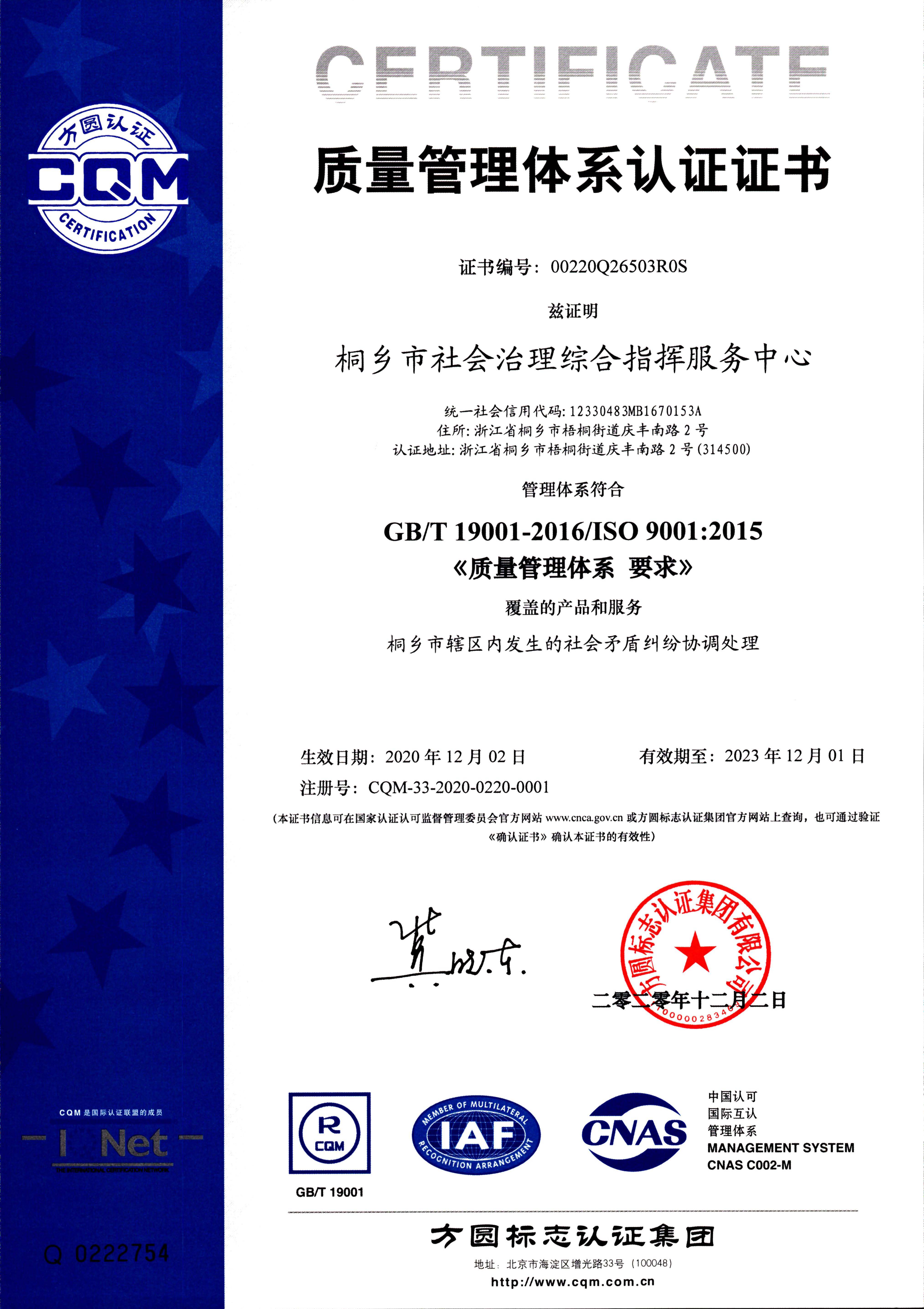 方圆浙江公司委派专家对桐乡市社会治理综合指挥服务中心的管理现状进行全面调研、评估,系统梳理岗位职责、工作流程、工作业绩等内容,形成标准化文件并组织实施,使之适用于机关单位的“标准化、规范化、制度化、信息化”建设。在双方的共同努力下,2020年12月桐乡市社会治理综合指挥服务中心顺利通过审核并获得证书,成为全省第一个同行业通过ISO9001审核的机关单位。这对桐乡市辖区内各类社会治理综合事务处理和矛盾调解的流程标准化具有很大的现实作用和社会价值,标志着桐乡市在社会治理能力现代化建设上迈入了新的阶段。