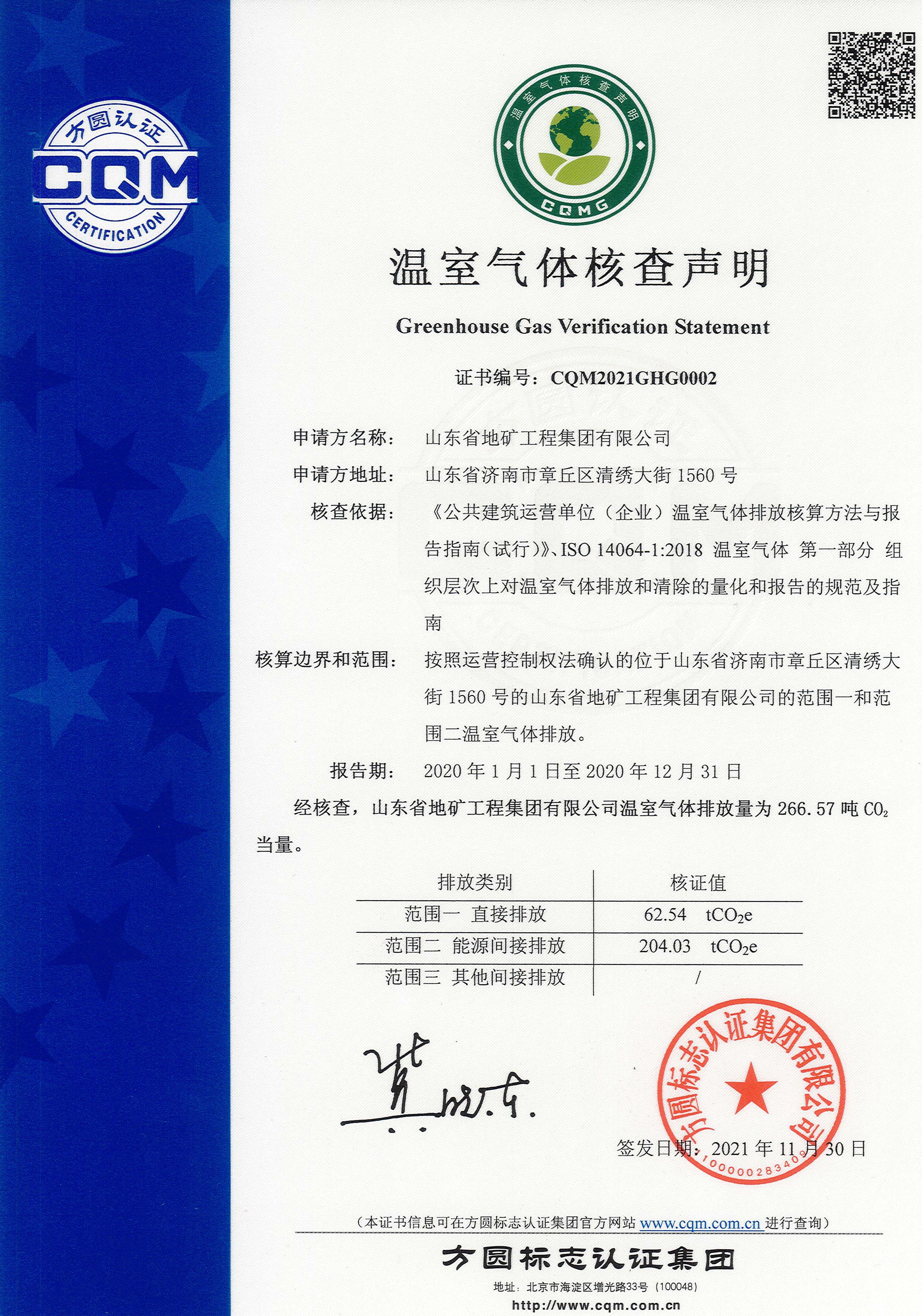 方圆山东公司为山东省地矿工程集团有限公司颁发温室气体核查证书
