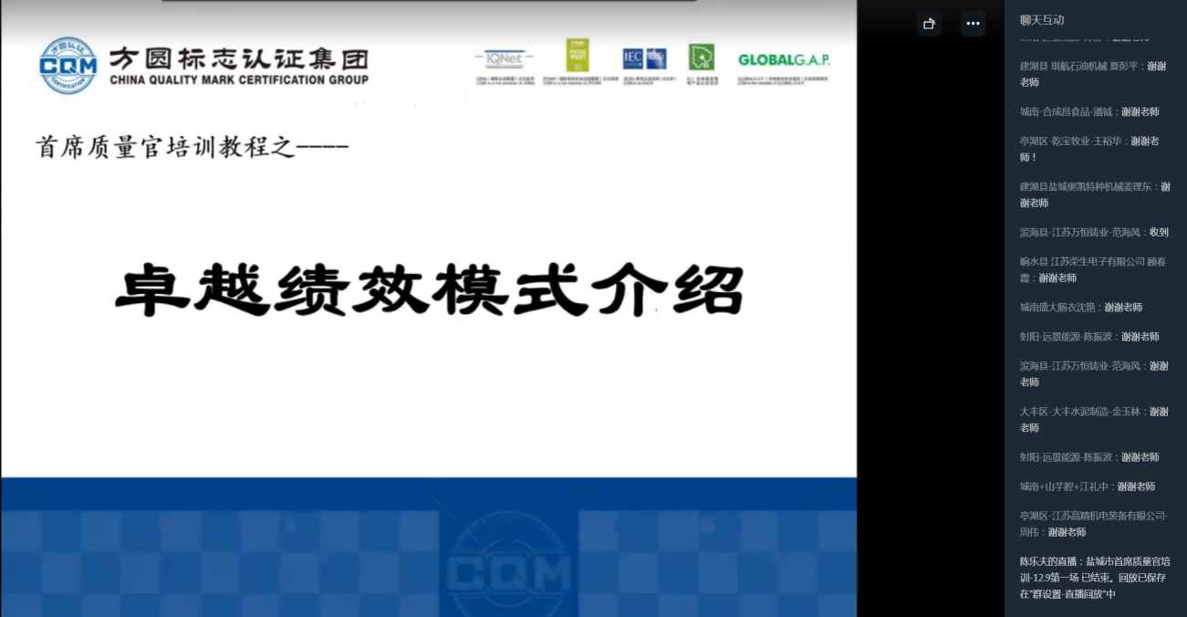 首席质量官(Chief Quality Officer,CQO),又称质量总监。作为企业中的第一质量人,CQO是企业战略小组的关键一员,负责创建以品质为核心的OD官方网页版,塑造企业质量竞争力。通过培训将为盐城市企业培养一批合格的首席质量官,以便更好地履责并提升质量管理水平,促进地方经济高质量发展。直播室学员学习认真投入,与授课教师线上交流互动不断,受到了学员的一致好评。
