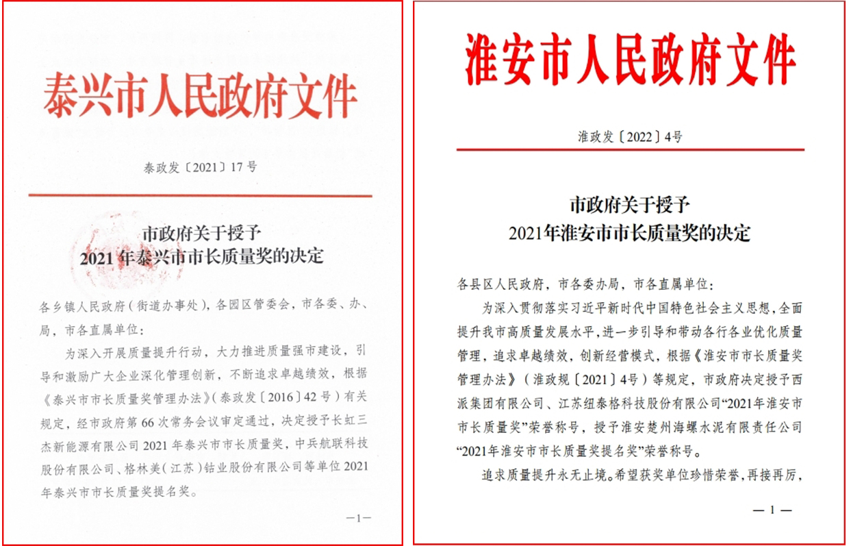 方圆规划研究(江苏)有限公司辅导的两家企业分获2021年度淮安市市长质量奖和泰兴市市长质量奖