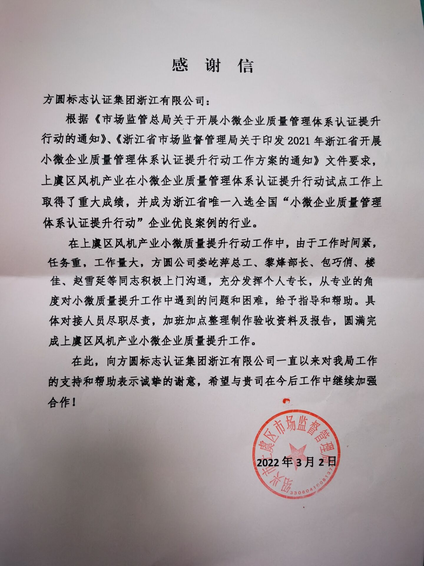 新年伊始,阳春三月,上虞区市场监督管理局特发“感谢信”一封,表扬此项目中辛勤付出的方圆认证浙江公司的各位同仁。喜乐有分享,责任有担当,方圆浙江公司将矢志不渝地做好浙江小微企业质量提升的坚强后盾。