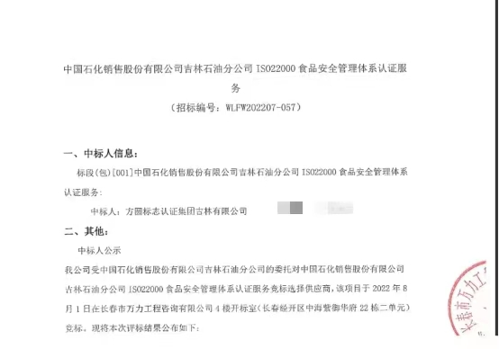 方圆吉林公司成功中标中国石化销售股份有限公司吉林石油分公司ISO22000食品安全管理体系服务项目