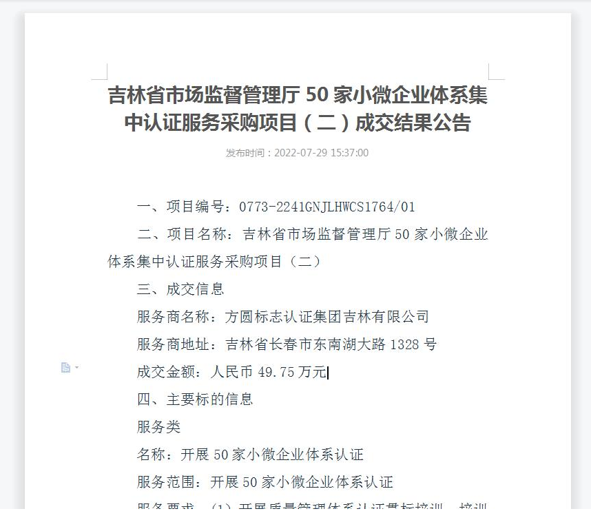 方圆吉林公司成功中标吉林省市场监督管理厅50家小微企业体系集中认证服务项目