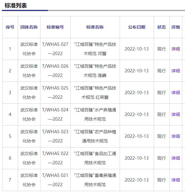 时间:2022年10月21日 近期,由武汉农业集团主导,方圆标志认证集团牵头、方圆湖北公司参与编制的武汉市农产品区域公共品牌“江城百臻”系列团体标准顺利通过专家组的评审,在全国团体标准信息平台进行发布。包括:《“江城百臻”畜禽养殖通用技术规范》T/WHAS 021—2022、《“江城百臻”食品加工通用技术规范》T/WHAS 022—2022、《“江城百臻”农产品种植通用技术规范》T/WHAS 023—2022、《“江城百臻”水产养殖通用技术规范》T/WHAS 024—2022、《“江城百臻”特色产品技术规范 红菜薹》T/WHAS 025—2022、《“江城百臻”特色产品技术规范 莲藕》T/WHAS 026—2022、《“江城百臻”特色产品技术规范 河蟹》T/WHAS 027—2022。