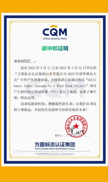 大会筹备期间,根据国家生态环境部发布的《大型活动碳中和实施指南》,方圆山东公司通过购买经核证的VCS项目减排量,实现会议碳中和。作为方圆山东公司的首个零碳会议,我们为每位参会人员颁发了个人碳中和证书,践行绿色低碳行动,为助力我国碳达峰目标和碳中和愿景的实现,贡献方圆智慧和力量。