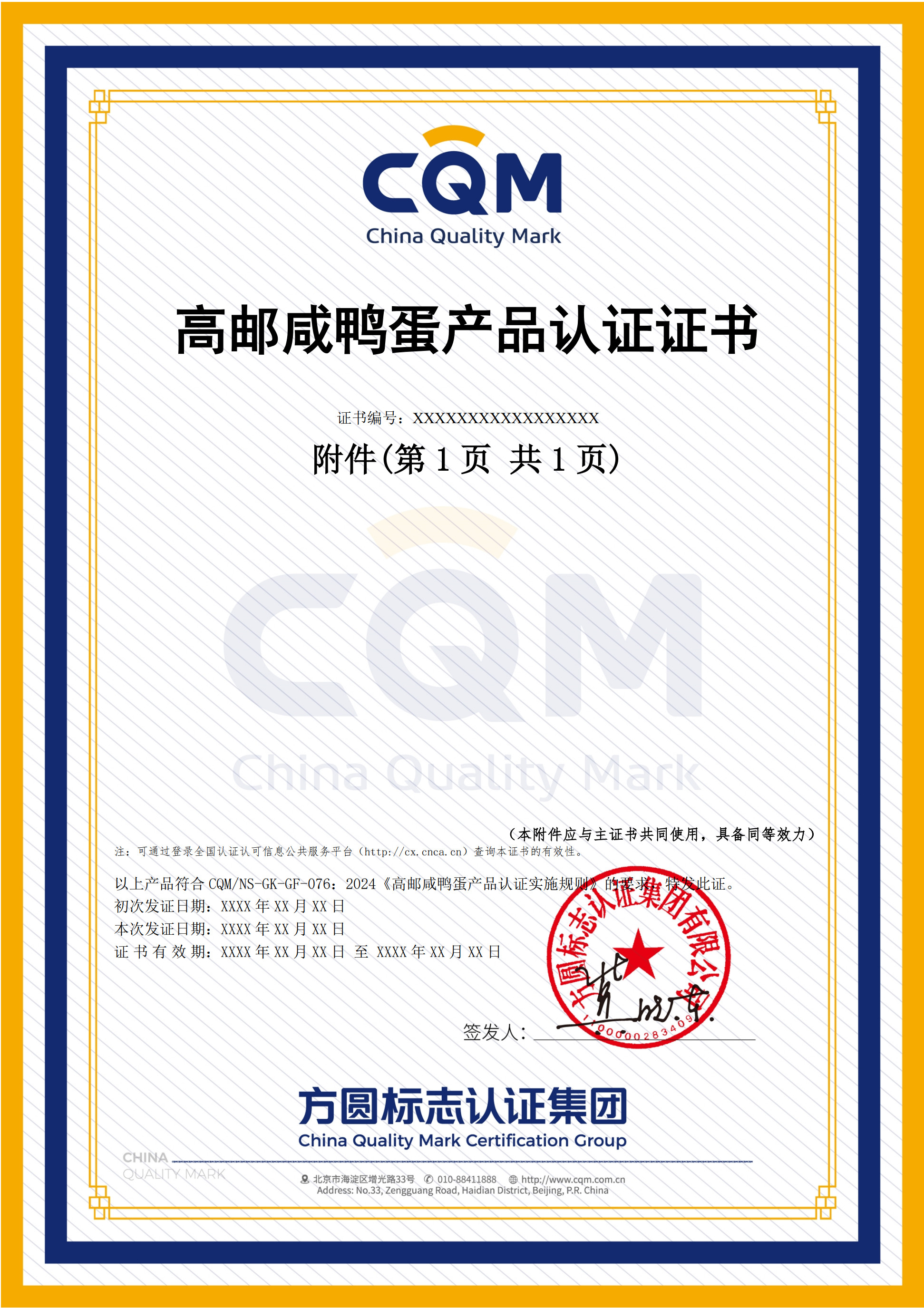 高邮咸鸭蛋是指在地理标志产品保护范围内,以高邮鸭特有的饲养方式饲养的高邮鸭所产的蛋经过挑选后为原料的蛋,经用盐水或含盐的黄粘土或草木灰腌制而成的再制蛋。具有鲜、细、红、油、嫩等特点。高邮咸鸭蛋产品认证是由CQM方圆第三方专业认证机构依照国家认证认可监督管理委员会认证管理要求,按照相应产品实施规则和技术规范的要求,对咸鸭蛋进行的合格评定活动。