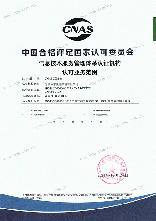 信息技术服务管理体系认证认可证书