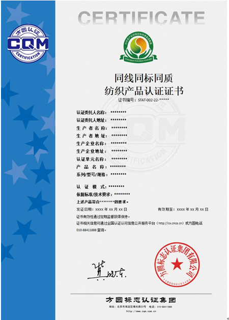 | 1 | 婴幼儿产品 | STAT CQM24-1800-05-2022“同线同标同质”纺织产品认证实施规则 | STAT CQM2401-2022 “同线同标同质”纺织产品技术规范 |