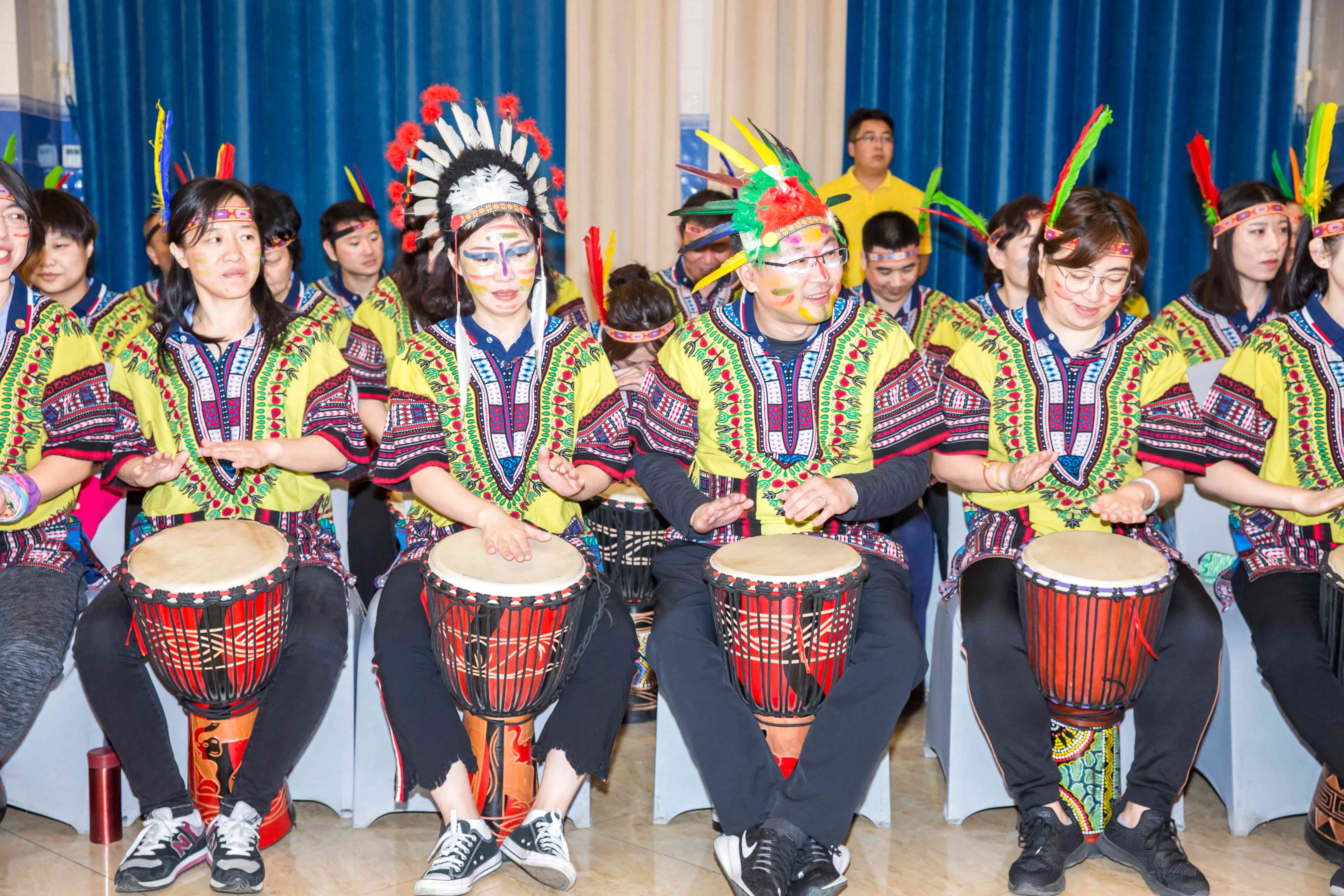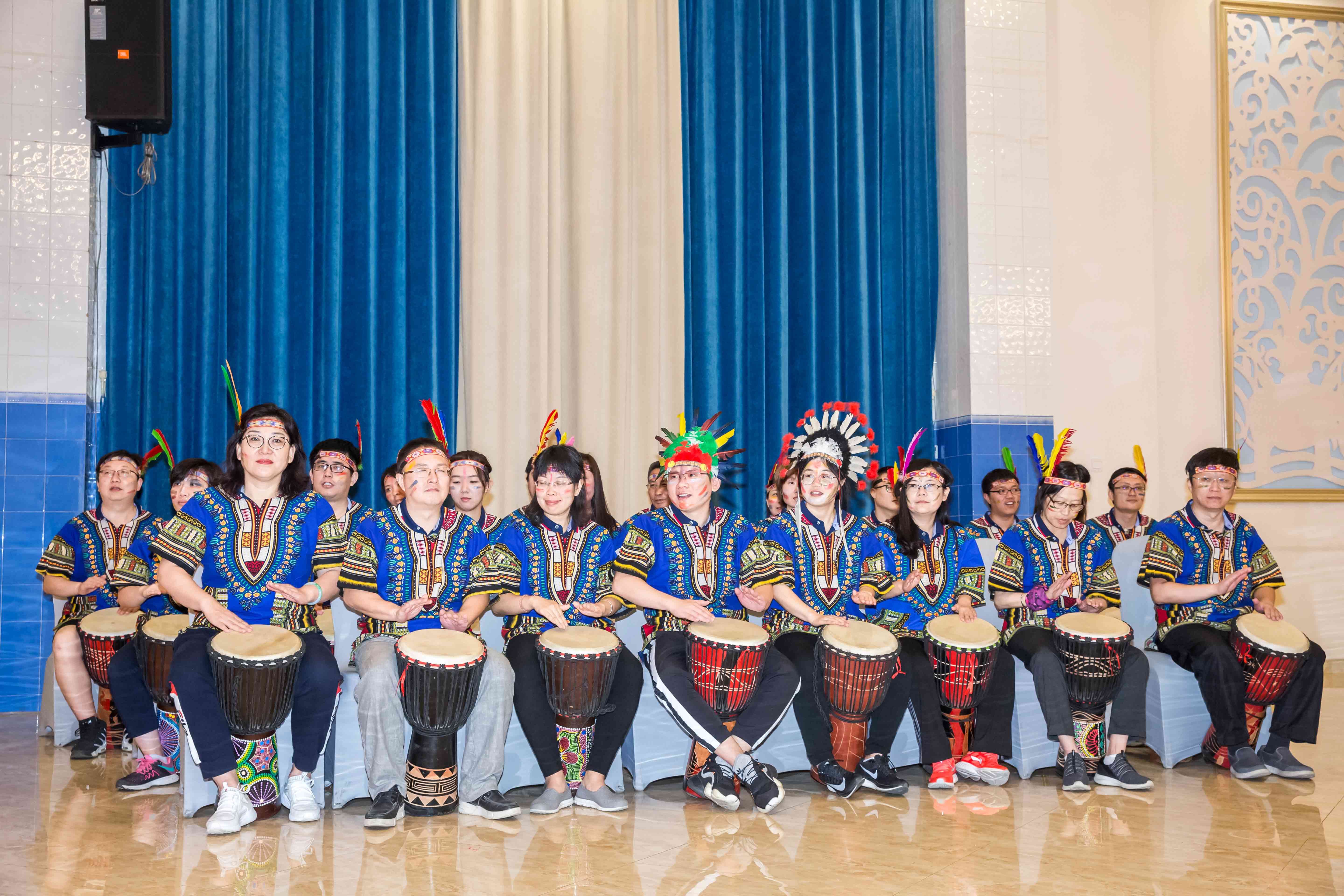 第二天在室内进行了经典拓展培训项目“非洲鼓”,全体员工分为四个部落,脸上化着原始的妆容,穿着美丽的部落服饰,从“咚嘟嘟”到“咚嘟嘟咚哒”,鼓点节奏学习的难度越来越高,但每个人散发的热情越来越高昂。最后,每个部落通过鼓乐师的指导下努力的学习和自身的创意为大家带来了精彩的“鼓舞表演”。