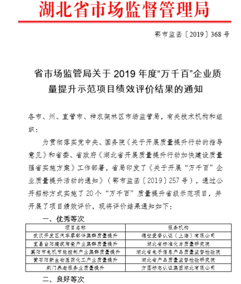 此次评价是湖北省市场监督管理局2019年质量提升行动的延伸活动。