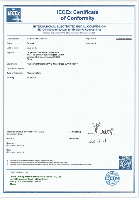 2019年,方圆集团获得国际组织认可,顺利取得国际电工委员会电工产品合格测试与认证组织(IECEE)CB体系的国家认证机构(NCB)资质,成为同时具备国际电工委员会防爆电气安全体系(IECEx)、国际电工委员会电工产品合格测试与认证组织(IECEE)CB体系的双资质认证机构。作为双资质认证机构,方圆为对标国际先进标准的高品质产品提供技术保障,充分发挥国内合格评定机构的责任担当。作为IECEx国内分秘书处,2021年,方圆组织IEC合格评定体系国内技术机构完成了IECEx体系I类矿用防爆电气产品范围确认;在中德合格评定合作工作组框架下,基于IECEx互认机制,方圆与德方机构签署了《方圆防爆CCC电气产品与CE(ATEX)认证的互认协议》,实现两种制度间认证结果的互认转换,促进了我国检测认证结果得到更广泛的国际认可,助力防爆电气生产企业“走出去”。今年9月,方圆集团为国内某防爆电气生产企业的矿用隔爆型变频调速一体机签发了IECEx矿用设备认证证书,这是中国国家成员机构(认监委)2021年决策确认IECEx矿用设备认证范围以后,由本土机构签发的第一张IECEx矿用设备认证证书。
