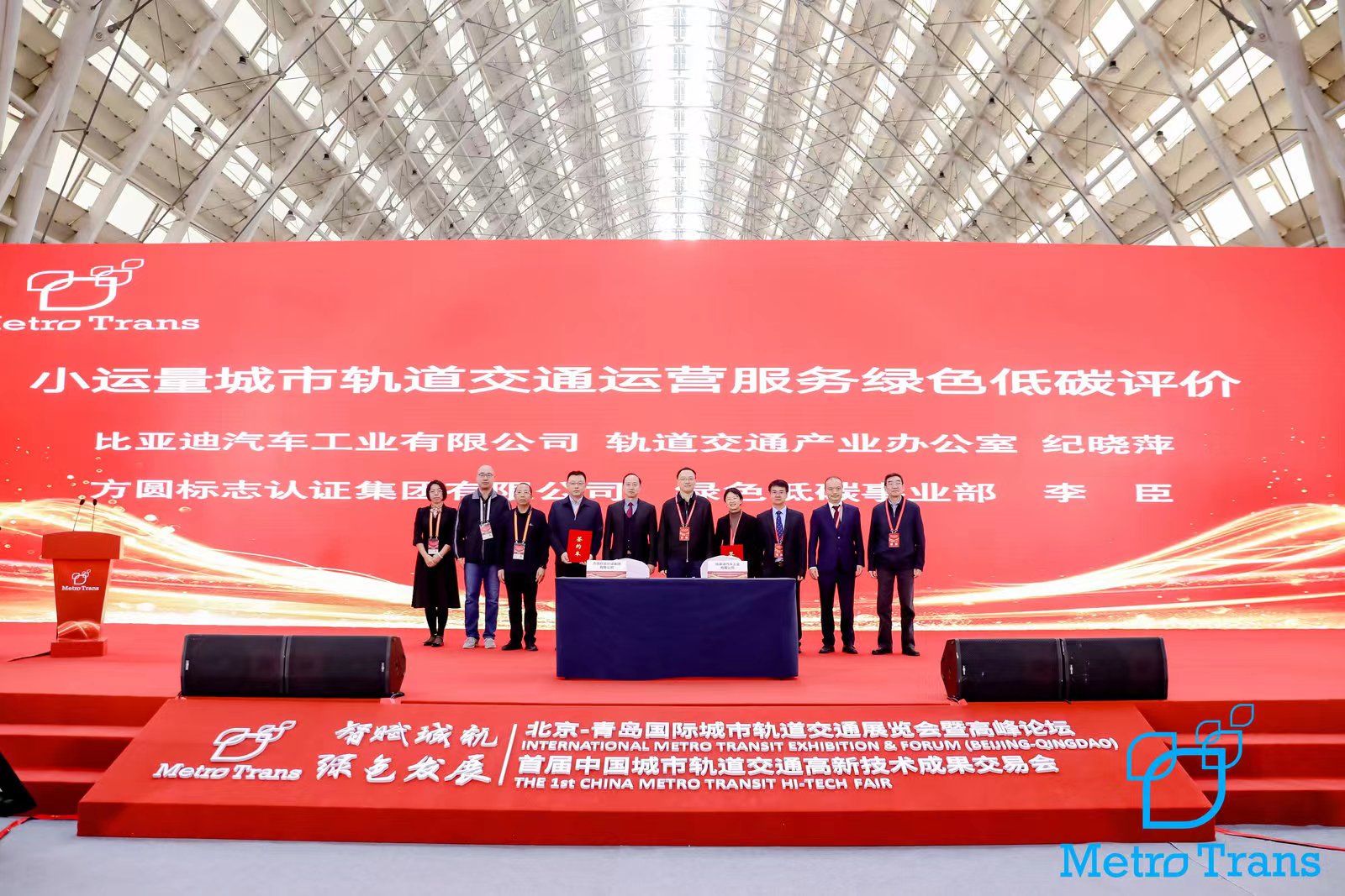 4月27日,中国城市轨道交通协会主办的首届中国城市轨道交通高新技术成果交易会(简称首届城轨高交会)在中铁青岛世界博览城顺利举办。在首届城轨高交会高新技术成果签约活动中,CQM方圆基于绿色低碳领域的研究成果,与比亚迪汽车工业有限公司签署了小运量城市轨道交通运营服务绿色低碳评价科研合作项目。