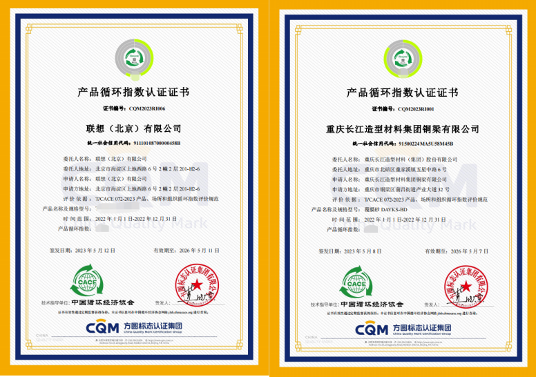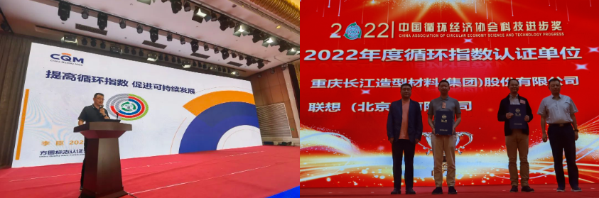 CQM方圆联合中国循环经济协会在“科学技术奖颁奖盛典”环节向联想(北京)有限公司、重庆长江造型材料集团铜梁有限公司颁发了首批产品循环指数认证证书;并在主题报告环节做了《提高循环指数 促进可持续发展》演讲介绍。