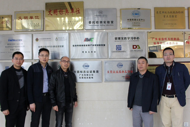 12月9日,方圆广东公司与广东省东莞市质量监督检测中心在东莞质检中心大楼举行了隆重的挂牌仪式,方圆广东公司“东莞认证服务工作站”、“东莞培训基地”正式成立。东莞市质量监督检测中心谷历文主任、业务部周斌部长,方圆广东公司熊飞彪、张耿彬、陈明东副总经理出席了挂牌仪式。