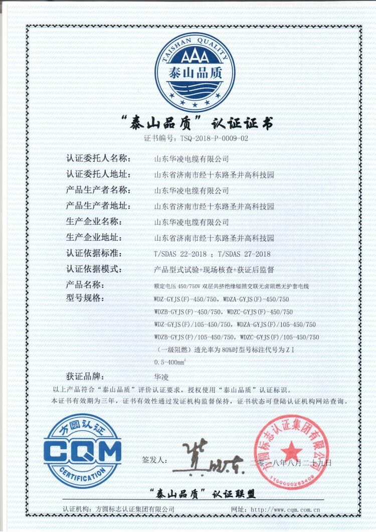 山东省首批申报“泰山品质”产品认证的有十家企业,方圆山东公司完成了山东华凌电缆有限公司、山东滨州亚光毛巾有限公司两家企业的 “泰山品质”评价工作,并发放了“泰山品质”认证证书。
