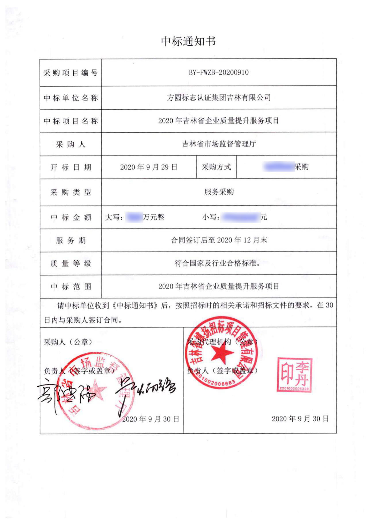 方圆吉林公司成功中标吉林省市场监管厅2020年度吉林省企业质量提升服务项目