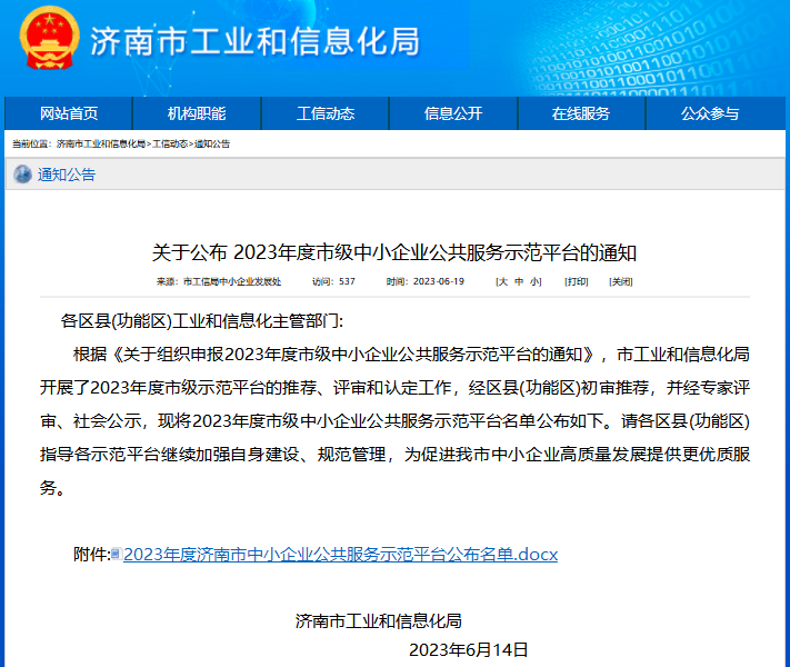 近日,根据《OD官方网页版-OD(中国)组织申报2023年度市级中小企业公共服务示范平台的通知》、《OD官方网页版-OD(中国)印发〈济南市中小企业公共服务示范平台认定管理办法〉的通知》(济工信中小企业字〔2021〕5号)等文件规定,经企业自愿申报、区县中小企业主管部门初审推荐、专家评审等程序,济南市工业和信息化局公布了2023年度济南市中小企业公共服务示范平台名单,方圆标志认证集团山东有限公司被认定为2023年度济南市中小企业公共服务示范平台。